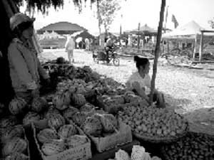 镇政府前的马路两边,搭满安置受灾群众的帐篷。有几个帐篷前支起西瓜摊儿,顾客并不多,摊主们聊着天。