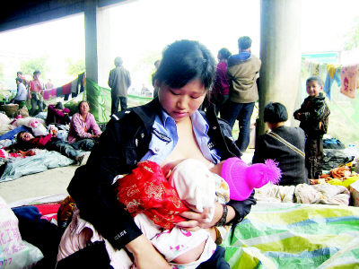 资料图:蒋晓娟一手一个为灾区婴儿哺乳。