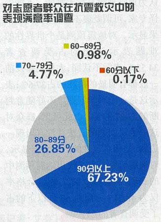 数据显示,对志愿者在抗震救灾中的表现,67.23%的受调查者给出了90分以上的高分,给80分以上的则占到了94.08%,满意率达到了98.85%。NGO组织和志愿者群体是此次抗震救灾中的一支特别突出的力量,社会、新闻媒体无不为他们的出现和广泛参与欢欣鼓舞,并喻其为公民社会发育的有力证明。从雪灾到3·14藏独事件,再到汶川大地震,中华民族可谓空前团结,爱国热情一浪高过一浪,在这一浪又一浪的爱国热情面前,年轻人受到了洗礼,“80后”、“90后”得到了很好的锻炼,表现让世人侧目。在志愿者队伍里,活跃着为数不少的“80后”、“90后”,绿丝带等志愿行动多数就是由他们发起。唐山志愿者、山东农民工志愿者等等都给人们留下了深刻的印象。