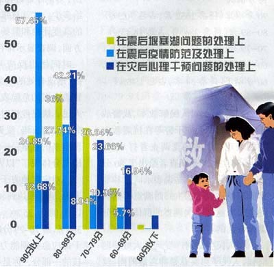 数据表明,对党和政府在抗震救灾中的表现,满意率达到94.81%。其中,对党和国家领导人在抗震救灾中的表现,受调查者普遍表示了高度赞扬,90%的受访者表示满分是多少就给多少。这就意味着群众对党和政府的高度评价和赞扬。其中得分最高的方面,调查显示排在前四位的是:在第一时间做出反应并赶赴抗震救灾前线、迅速有效的应急反应和指挥部署、冒着余震的危险夜以继日地安抚灾区人民、情况危机时刻和看望灾区人民时的动情言语。受调查者表示,政府表现出来的尊重每一个平民的生命的举措充分体现了“以人为本”的理念。