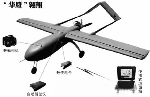 这款名为“华鹰”的无人机数次出现在青川、北川,对抗震救灾发挥了积极的作用。据四川省测绘局的专家介绍,“华鹰”是四川省测绘局专程向国家测绘局申请派来支援灾区的。“华鹰”无人机航摄系统通过了国家测绘局鉴定,飞机系统采用GPS导航自主飞行,装备专业数码相机,可在半径15千米的范围内稳定可靠飞行3小时,自动拍摄地面高分辨率航空影像,生成高清晰地面影像。
