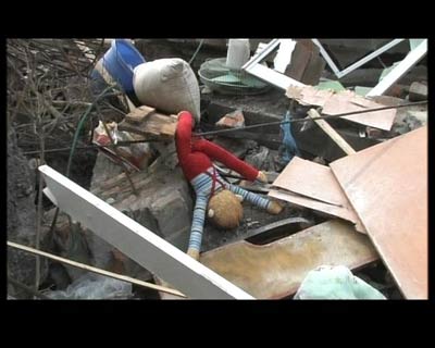 冯小宁:我下来的时候就不是为了拍一个电影而下来,现在到了北川以后,我有这么多天以后,我有更强烈的一个感受,我不拍,我不会拍,我可以写,我手中有第一手的资料,我也有拍摄这种灾难大片的超常的本事,我无法去用电影的真实再营造那种灾难,摧毁我们那么多生命的这种过程,这是我从良心深处不愿意做的事情。因为我可以营造一切故事、气氛,这么多真实的东西都是最感人的素材,但是有一点我做不到,就是我无法去营造地震的瞬间,那么多活生生的生命,那种惨状,我不能再现它,我受不了。我设想我们做电影的可以重现那些东西,孩子们从教室中向外奔跑,最后塌下来,把他们压倒,做不到。而且我在灾民之中,我深知如果这些电影再让他们看见的时候,是对他们多么强大的一种人性上的摧残,对所有活着的那些上百万的四川灾民。就在给我开车的那个司机朋友,实际上他也是个干部,他就说到,他的夫人,其实大家在电视中就知道,就是刚出生三个月的婴儿,他爱人都一起被砸在里边,然后他说太感动了,母爱的伟大,自己在里头三四天,才被救出来,自己都生命都不保,但是还喂婴儿,喂她的孩子,我觉得他们才真让我们觉得惊讶,就是一个普通的朋友,为我们开车,他的故事就可以说惊动全世界。他们有句话,说我们北川几万个家庭,每一个家庭都是惊心动魄的故事。坐在车后头坐的一个工程师,他一家人都没了,就剩他孤身一个,因为什么?正好他那天出差,到旁边的一个县去出差,回来以后都没了。第二天我们去北川的废墟那儿拍摄的时候,他们就去,他说他的儿子开出租,那天正好在停车场那儿,出租车都停在那儿,地震发生以后,这些人就失踪了,因为被一座山给埋了,整个山上的巨石,十米直径的那种大巨石成群地滚下来,没了。所以他走到那儿的时候他就说你看,我儿子就在这里头,正好他们在那儿翻,翻到一个被砸碎的,车都砸得乱七八糟的,碎末,他从一个碎石缝里头翻出,我看前保险杠,我拍下来了,他捡起了一个车牌,他说正好这个车牌就是我儿子的,后来大家就往前走,我就说了一句,我说你还是把它收起来吧,这是你孩子唯一的东西,因为家都没了,孩子唯一的一个纪念物,他就把它收起来,拿一个塑料袋兜起来。