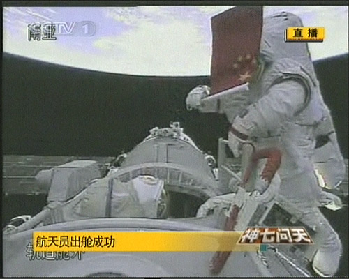 中新网9月27日电 神七航天员翟志刚北京时间16:43分顺利出舱,刘伯明刚才将国旗递给翟志刚,翟志刚将五星红旗在太空中挥动。目前,航天员出舱10多分钟。