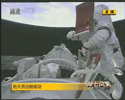 16时48分,翟志刚在太空迈出第一步,中国人的第一次太空行走开始了。 在翟志刚身穿的白色航天服上,鲜艳的五星红旗显得格外醒目。