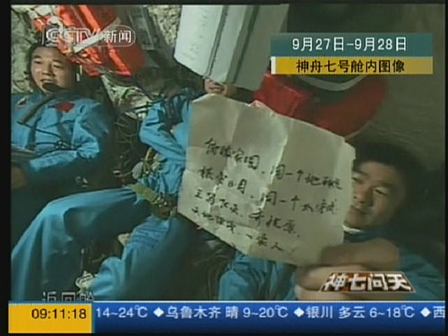 电视画面显示,三位航天员面带微笑,表情轻松愉悦,刘伯明还向镜头展示了一张字条。