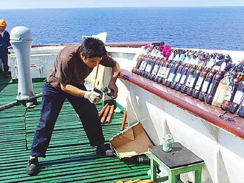 船员们搬出空的啤酒瓶,往里灌上易燃的“油漆水”,再用棉纱浸上柴油做导火索,准备了200多只“土燃烧瓶”退敌 (照片发自亚丁湾上“振华4号”)