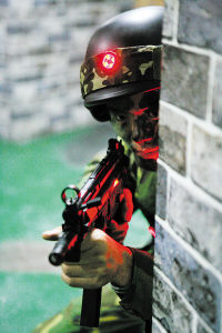 头顶上机群盘旋俯冲,身边枪声、爆炸声此起彼伏,一场激烈的对抗正在一个特殊的“战场”进行。1月8日上午,记者在济南军区某团真人CS对抗阵地看到:“战场”上矮墙林立、沙包堆积、枯树横亘……战士们身着作训服,手持仿真枪,头戴装有感应器的头盔,在时明时暗的“夜空”下穿梭,寻找目标,激烈对抗。据有关负责人介绍,实施真人CS对抗练兵在我军部队还是首家。(CS是Counter-strike的缩写,中文意为反恐精英。)