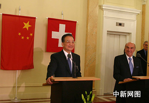 当地时间27日晚,温家宝在伯尔尼宫与瑞士联邦主席梅尔茨举行会谈,并共同会见记者。