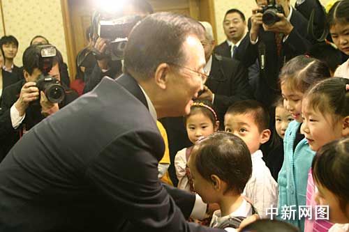 当地时间二月一日中午,正在访英的中国总理温家宝来到使馆看望中国驻英外交官和华侨华人。一群衣着鲜艳的孩子向温家宝献上鲜花,并齐声朗诵温家宝的诗作《仰望星空》。温家宝亲热地探下身与孩子们问好。中新社记者 张朔摄