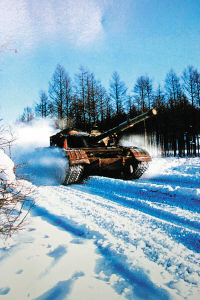 “‘敌’一个营的兵力向我指挥所进犯,命你部迅速出击!”正在野外进行冬季适应性训练的沈阳军区某装甲团突然接到上级命令。坦克一营官兵用燃油加热器快速对水箱和油箱进行加温。不到10分钟,铁甲战车卷着雪浪向茫茫林海深处驶去。