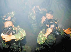 2月12日上午,广州军区某部组织共同课目考核。连长张履宏指着一个大帐篷说:“这就是防化训练的‘染毒地域’。”但是,战士们并不紧张,一名老兵悄悄告诉记者:“里面不是真的毒气,是烟雾。”