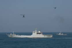 紧急出航的海上反恐舰艇编队,向货轮遭劫持海域全速航行,舰载机适时起飞侦寻。接到命令不到半小时,舰载机便发现目标。