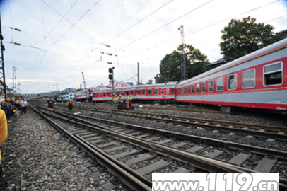 经侦查得知,此次列车相撞事故是由K9017次列车撞上了稍前脱轨的K9063列车,K9017次列车继而撞上了旁边民房。事故发生地为飞虹桥道口,现场约70人受伤,发现3人遇难。支队全勤指挥部立即将参战官兵分成2组,分别对2列相撞火车和民房被困人员展开救援,一组负责民房倒塌处的工作,一组负责相撞列车的救援工作。第一组官兵冒着民房再次塌方的危险,采用减扩器、撬棍、切割机、人工手挖等方式救出4人,挖掘出1具尸体。另一组官兵负责列车救援工作,因车厢严重扭曲变形,参战官兵采用撬棍、起重气垫、液压撑顶器、千斤顶等工具撑开列车变形部分,战士们冒着车厢随时可能再次坍塌的危险为被困乘客打开生命通道。