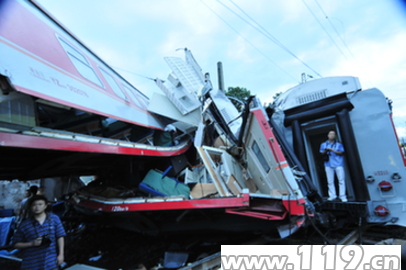 6月29日2时33分许,湖南公安消防总队郴州市消防支队指挥中心接到报警:飞虹桥道口两列客运火车相撞(K9017次列车撞上了稍前脱轨的K9063次列车),其中一列撞上附近一民房,请求救援。