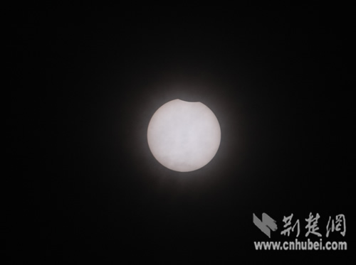 22日上午8时14分,日全食初亏在湖北武汉显现,图为记者在湖北日报传媒大厦拍摄的初亏奇观。