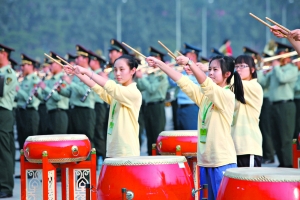 昨日下午3点开始,联合军乐团和合唱团、民族打击乐团共4000余人在联合军乐团驻地进行了合练。记者在现场看到,广场乐声悠扬,气氛热烈。一些大学生合唱团成员从各自高校乘大巴赶至郊外,有些学生晕车刚吐完就上场加入合练。