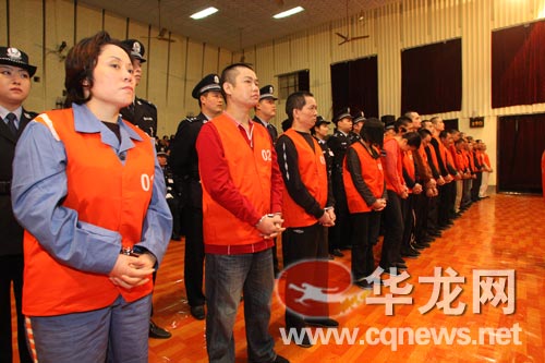 今日(14日)上午9时30分,谢才萍“涉黑”团伙共22人,站上重庆市第五中级人民法院被告席受审。被指控为团伙头目的谢才萍,一审被指控犯组织、领导黑社会性质组织罪、开设赌场罪、非法拘禁罪、容留他人吸毒罪、行贿罪五宗罪。