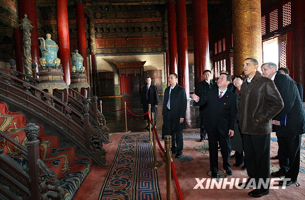 当天,碧空如洗,寒风凛冽,故宫金色琉璃瓦上还有残雪。下午2点10分,身穿褐色皮夹克的奥巴马,从位于天安门广场北面的故宫南门——午门,走进中国现今保存最大最完整的古代宫殿建筑群。