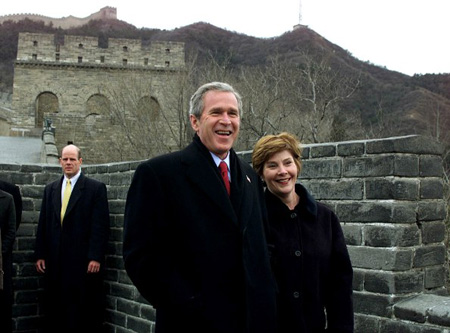 布什父子,这两位美国总统,跟长城有着更深厚的“缘份”。2002年,小布什访华时了却他一个时隔26年的心愿。他携夫人劳拉来到北京西北约70公里的八达岭长城,游览了这一闻名世界的历史古迹并题词留念。