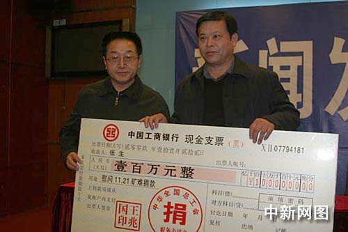 中新网鹤岗11月22日电 (记者 吴兆飞)中华全国总工会22日向鹤岗矿难遇难矿工家属捐赠100万元,中华全国总工会副主席、书记处书记张鸣起在捐赠仪式上还呼吁重视生产安全。此外,黑龙江和鹤岗的工会部门也同时分别捐赠了50万元和10万元。