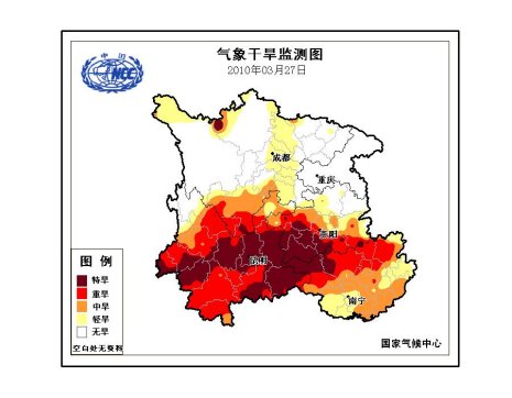 根据3月27日监测,云南大部、贵州西南部、广西西北部、川西高原南部等地存在重度以上气象干旱。