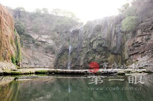 瀑布旁边的岩壁长满了文竹和马耳朵草,现在已经全部枯黄。景区里边的竹林、枇杷树等,大部分也枯黄。植被下边的泥土变成了沙,用手抓起来轻轻一捏就变成细小粉末,从指缝中往下滑。