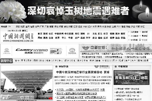 中新社广州4月21日电 (张乾铄)21日凌晨零时起,中国最具影响力的新闻网站人民网、新华网、中国新闻网等各大网站主页页面全部变为灰色,这是中国互联网界的统一行动:为青海玉树地震中遇难的同胞志哀,为玉树人民祈福。