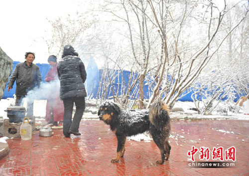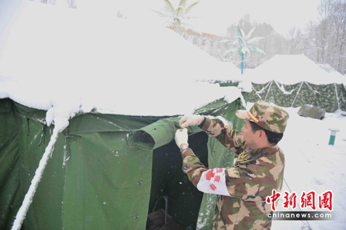 中新网玉树4月22日电(记者 贾国荣)今日清晨,青海省玉树地震灾区一夜风雪后,抗震救灾现场一片洁白,天寒地冻,救援倍加艰难。