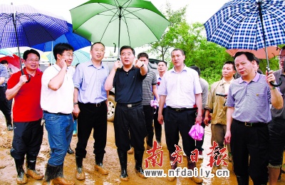 汪洋和省委常委、秘书长徐少华一到韶关,就在韶关市委书记徐建华、市长郑振涛等陪同下,赶到灾情最为严重的翁源县翁城区富陂村。