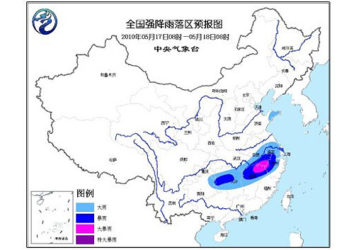 中新网5月17日电 中央气象台17日06时继续发布暴雨蓝色预警:预计,17日08时到18日08时,湖北东部、安徽中南部、江苏中南部、浙江中西部、江西中北部、湖南中北部、贵州东北部及山东半岛等地有大到暴雨。