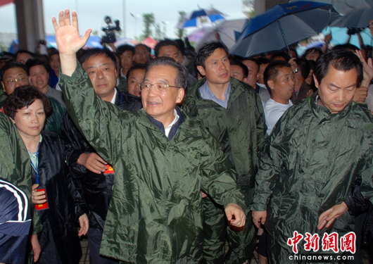 在罗针镇,温家宝冒雨在罗针镇高速公路的罗针收费站下车,直接到了险情的岸边,慰问现场抢险的人员。他和抢险的武警官兵亲切握手,并即兴发表了讲话。