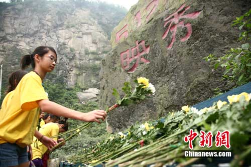 中新网成都7月31日电 (徐杨祎 张浪)31日,来自欧美大陆的170多位海外华裔青少年,前往“5·12汶川地震”震中映秀镇,参观地震遗址,寄托哀思。在地震飞来石祭台,同学们自发购买鲜花,深切哀悼在地震中不幸遇难的同胞们。
