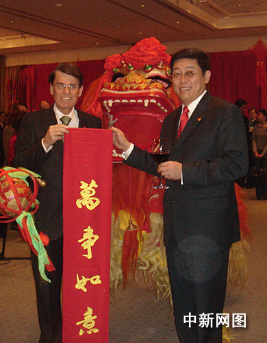 当晚,北威州州府杜塞尔多夫市的Radisson SAS 酒店灯火辉煌,喜红满堂,来自北威州和和领馆辖区的五百多位中德友人欢聚一堂,欢庆中国新年的到来,李海雁总领事和杜市市长埃尔文分别发表了新年祝词。