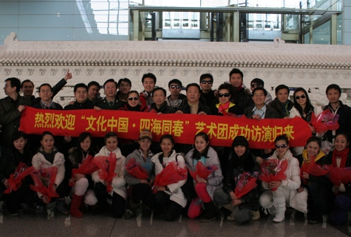 中新社北京3月10日电 (记者 陆春艳)继亚洲团、大洋洲团、欧洲团、南美洲团陆续返京,“文化中国•四海同春”北美洲团也于今日下午抵达北京。该团副团长、国务院侨办文宣司司长刘辉和团员们谈及此行难掩不舍和对明年演出的期待。