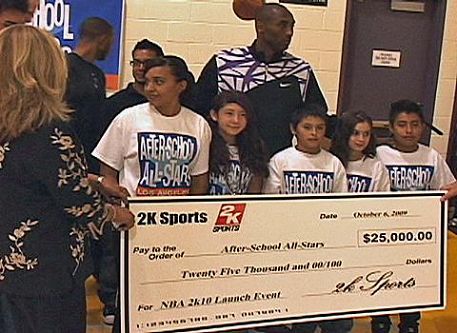 在洛杉矶的一个叫做《大家都是大明星课后辅导项目》的捐款仪式上,科比主持篮球电子游戏比赛,让他的湖人队同伴以及快艇队的两个球员戈登和卡曼大战中学生,在游戏对抗后,布莱恩特把一张两万五千美元的支票,捐给了洛杉矶辅导项目的执行长坎波斯。
