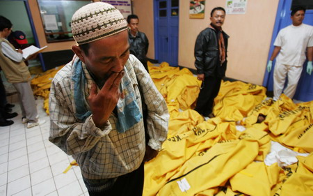 中新网7月18日电 据美联社报道,印尼爪哇岛南部印度洋海域当地时间7月17日下午3点20分左右发生强震,引发部分地区海啸。截至北京时间18日凌晨4点45分,共有105人被证实在海啸中死亡,127人失踪。图为幸存者在救助中心寻找亲属,或悲伤哭泣。(春风)