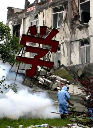 5月18日,防疫人员在映秀镇一处学校的废墟上喷洒消毒水。