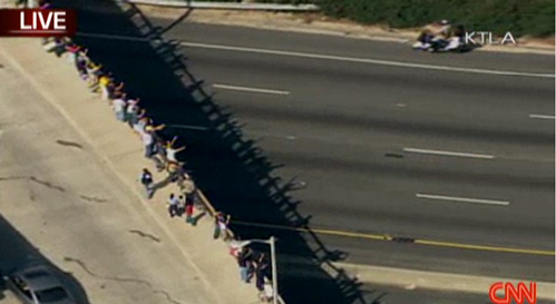 中新网7月8日电 CNN消息,因为杰克逊的公众追思会门票难求,很多没有票的歌迷只好在杰克逊灵车所要经过的高速公路上等待,希望送偶像最后一程。
