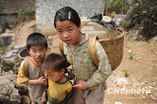 3月28日,遭受特大旱灾的世界长寿之乡广西巴马县,在长寿老人最密集的甲篆乡,年仅6岁的谭登保,背着重达20斤的水,翻高山回到位于半山腰的家。从供水点到家,要爬200多米高的山,需半个小时才能将50斤水背回到家。