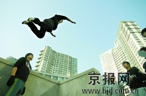 从去年年底开始,关于这项另类运动的视频开始风靡所有论坛。在视频中,跑酷者非常流畅地奔跑,遇到围墙就两脚一蹬翻过去,从四五米高的地方跳下时就地一滚继续前进,从一根栏杆跳到两三米外的另一根栏杆,能稳稳地站在上面。这项运动在上世纪90年代兴起于法国巴黎,迅速被各国年轻人所接受,去年9月份,伦敦举办了世界首个全球跑酷锦标赛。