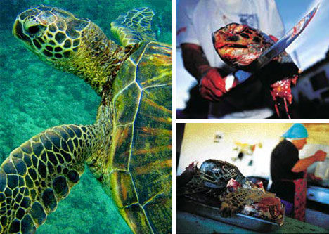 人们捕杀绿海龟是为了获得它们的壳、皮子、肉和脂肪。在1977年《濒临物种保护法案》颁布之前,海龟蛋与海龟肉是夏威夷的一道美味佳肴。现在,在印度尼西亚和南亚的一些国家仍旧捕杀海龟。