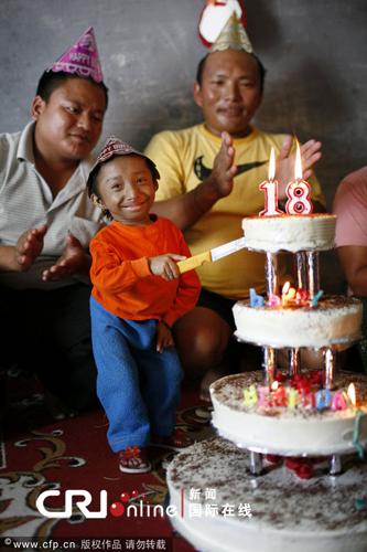 2009年10月10日,尼泊尔波卡拉,卡根德拉·塔巴·马加尔(Khagendra Thapa Magar)在一个和自己身高差不多的蛋糕前庆祝生日。据悉,他的生日愿望是找一个和自己一样袖珍的老婆。10月14日他将年满18周岁,届时身高只有51厘米的他将可以正式被吉尼斯世界纪录确认为世界上最矮的人