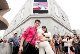 幸福的一对(后面大屏幕是张歌特意定做的画面) 本组图片 本报记者 车英 摄