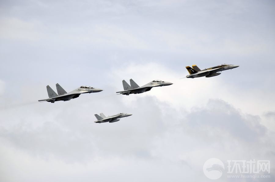 马来西亚海军的苏-30战机与美国海军的F/A-18战斗机组成编队从华盛顿号航母上空飞过