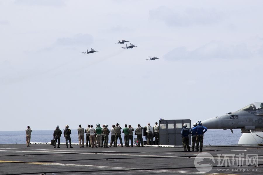 马来西亚海军的苏-30战机与美国海军的F/A-18战斗机组成编队从华盛顿号航母上空飞过