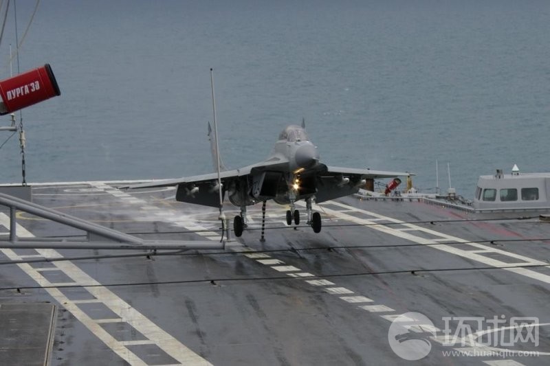 从甲板上拍摄到的舰载机在维克拉马蒂亚号上降落的场景