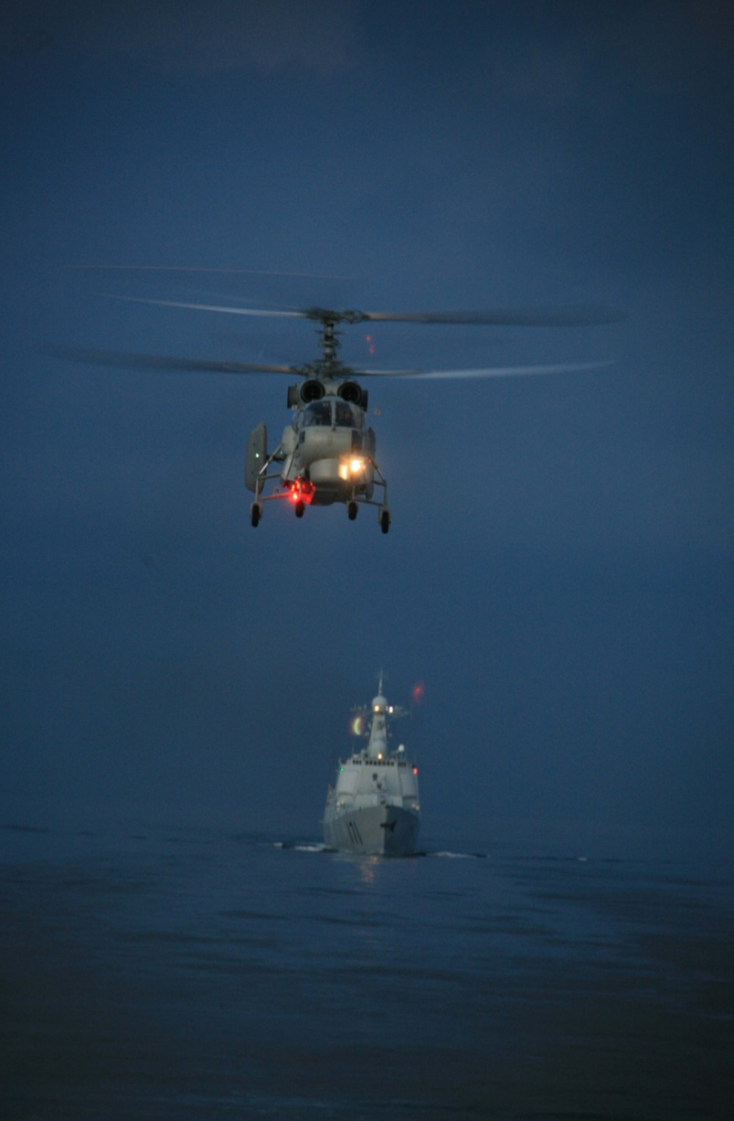 2008年12月28日夜,中国赴亚丁湾、索马里海域护航编队组织夜间直升机行进间着舰训练。越来越多的中国军人,正在以各种方式走出国门,走上国际舞台。联合国维和、国际人道主义救援、海外护航、中外军队联演联训、军事友好访问,处处展现出和平之师的良好形象。2008年12月26日,中国海军舰艇编队首次远赴亚丁湾、索马里海域,为过往商船护航。截至2012年7月,先后有12批护航编队参加护航任务,安全护送474批共4727艘中外船舶。新华社发