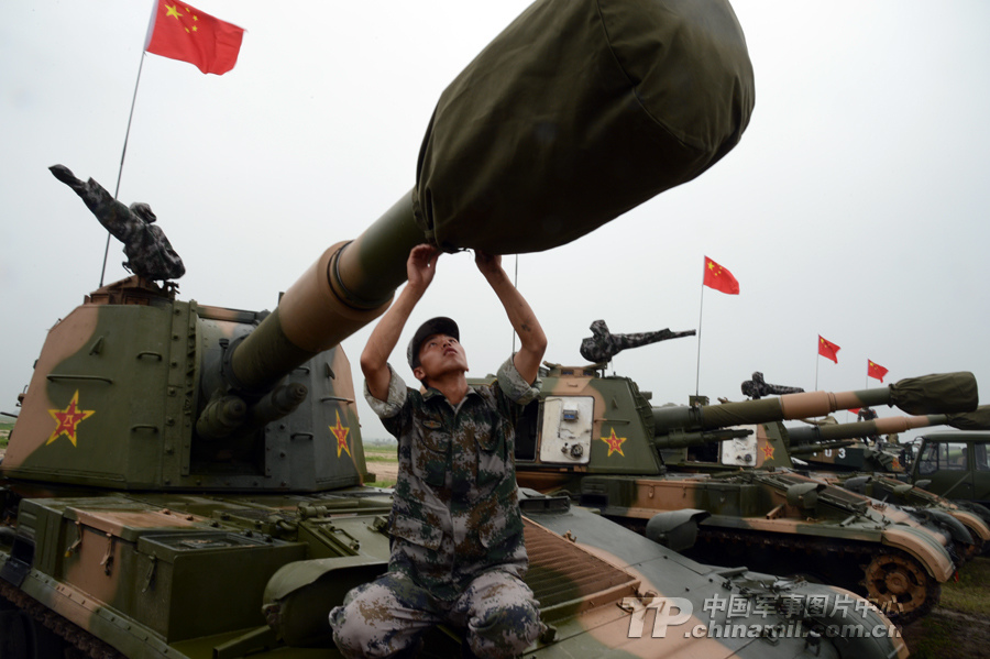 暴雨来临前期战士们正在为装备穿戴炮衣