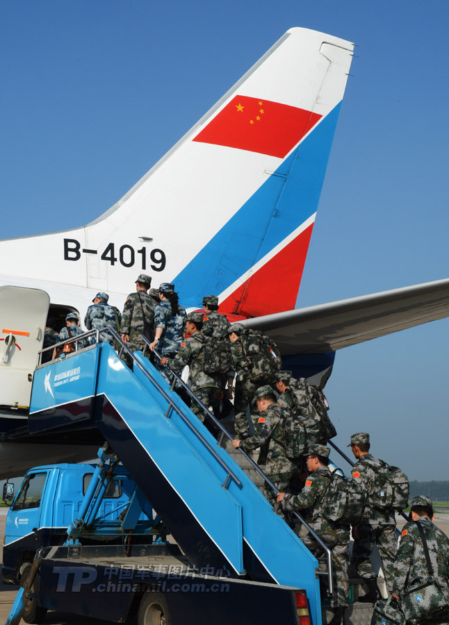图为中方导演部及指挥部人员乘专机全部出境,抵俄参演。中国军网记者李靖摄
