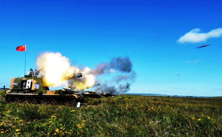 8月12日12时(北京时间12日下午2点),“和平使命-2013”中俄联合反恐军事演习在俄切巴尔库尔合同训练场进行实兵实弹协同训练,中俄双方出动所有参演兵力,对联合封控、分区清剿、火力突击等内容进行训练,时间大约50多分钟。图为中方炮火实施远程火力拦阻。新华社发 谭长俊 摄